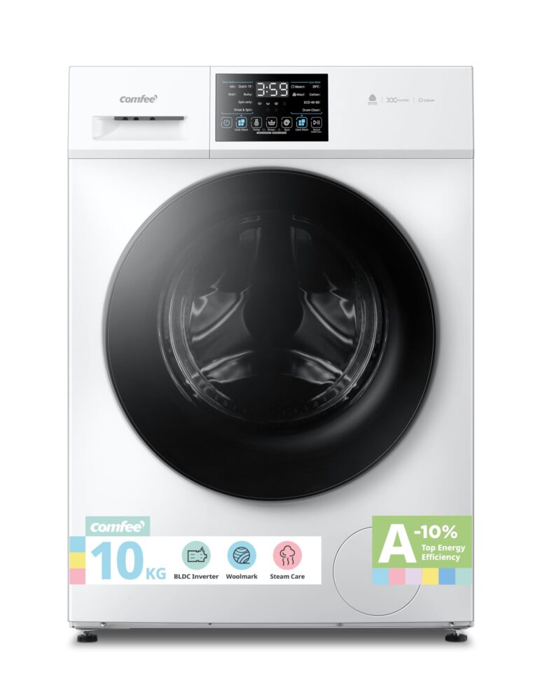 COMFEE’ Freestanding Washing Machine,10KG Load,A-10% Class,Steam Care,BLDC Motor,Woolmark,Touch Panel,White-CFP03EW100W-UK