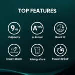 - 15 Washing Programs: anti-allergy, baby care, Super black, Sports, Drum cleaning, Spin, Rinse and spin, quick 15 min, Wool, Down, Eco 20℃, Eco 40-60, Mix, cotton, Skin Care
