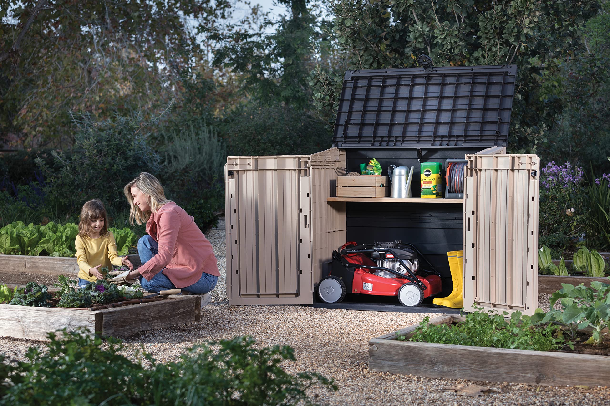 - Ideal outdoor storage solution for garden tools and equipment, BBQ and accessories and x2 120L wheelie bins
