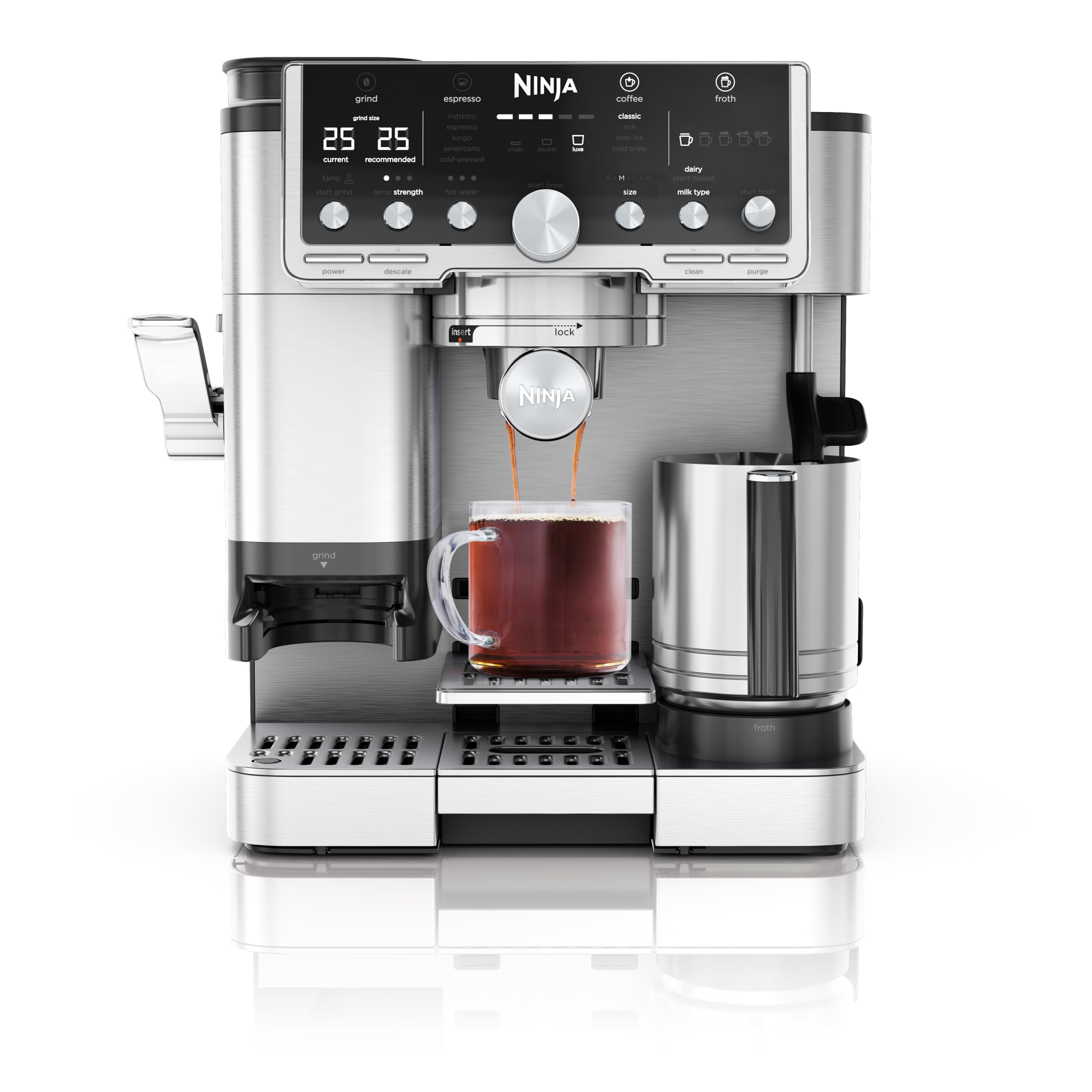 - INCLUDES: XL Froth Jug with Integrated Whisk, Built-in Grinder, Cleaning Brush, Starter Kit (Portafilter, Single Basket, Double Basket, Luxe Basket, Funnel & Integrated Tamper), Cleaning Kit, Water Hardness Test Kit & Recipe Guide.