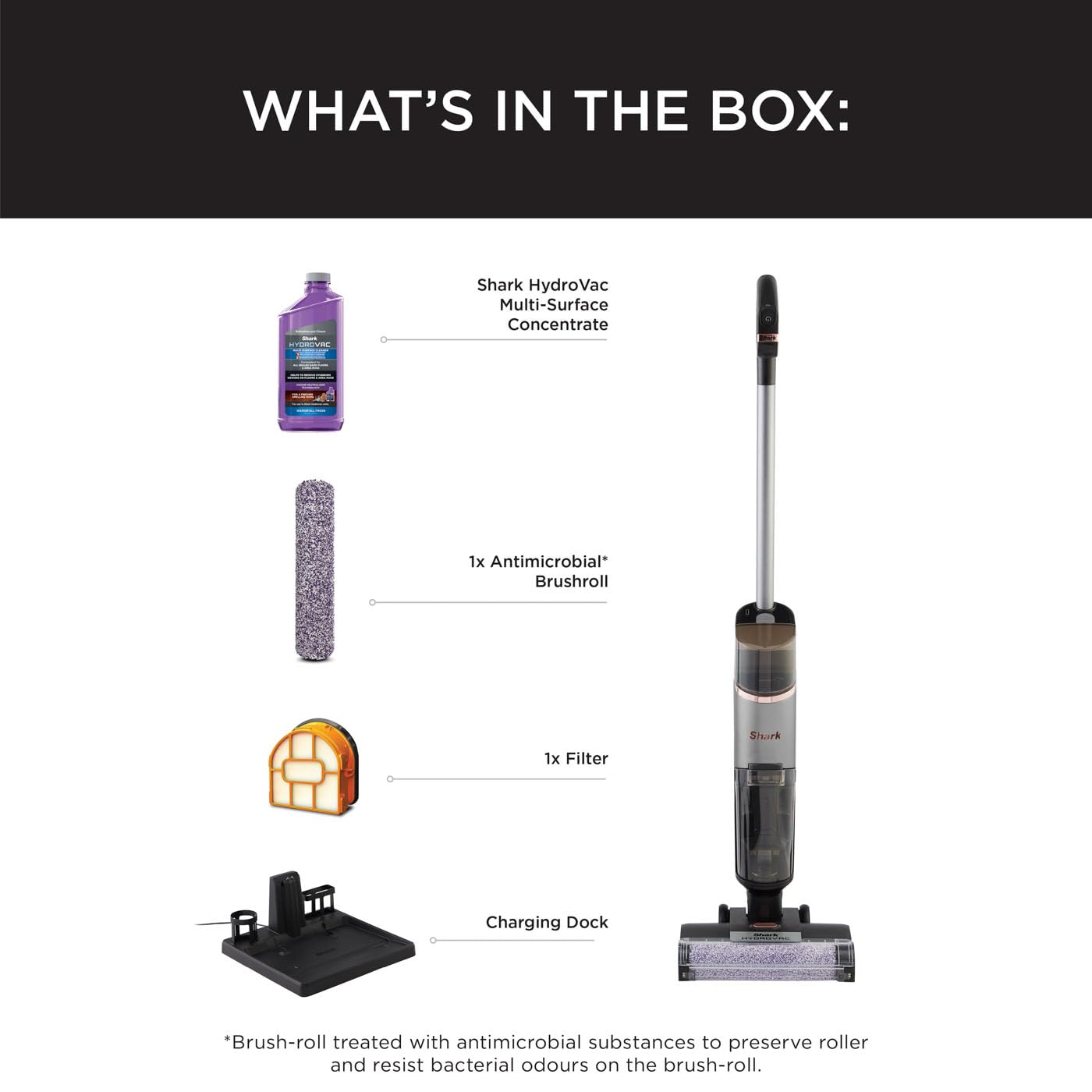 - INCLUDES: Shark HydroVac Cordless Hard Floor Cleaner, Brush-Roll, Filter, Multi-Surface Concentrate, Charging Dock – UK Plug. Weight: 3.95kg. Colour: Charcoal Grey